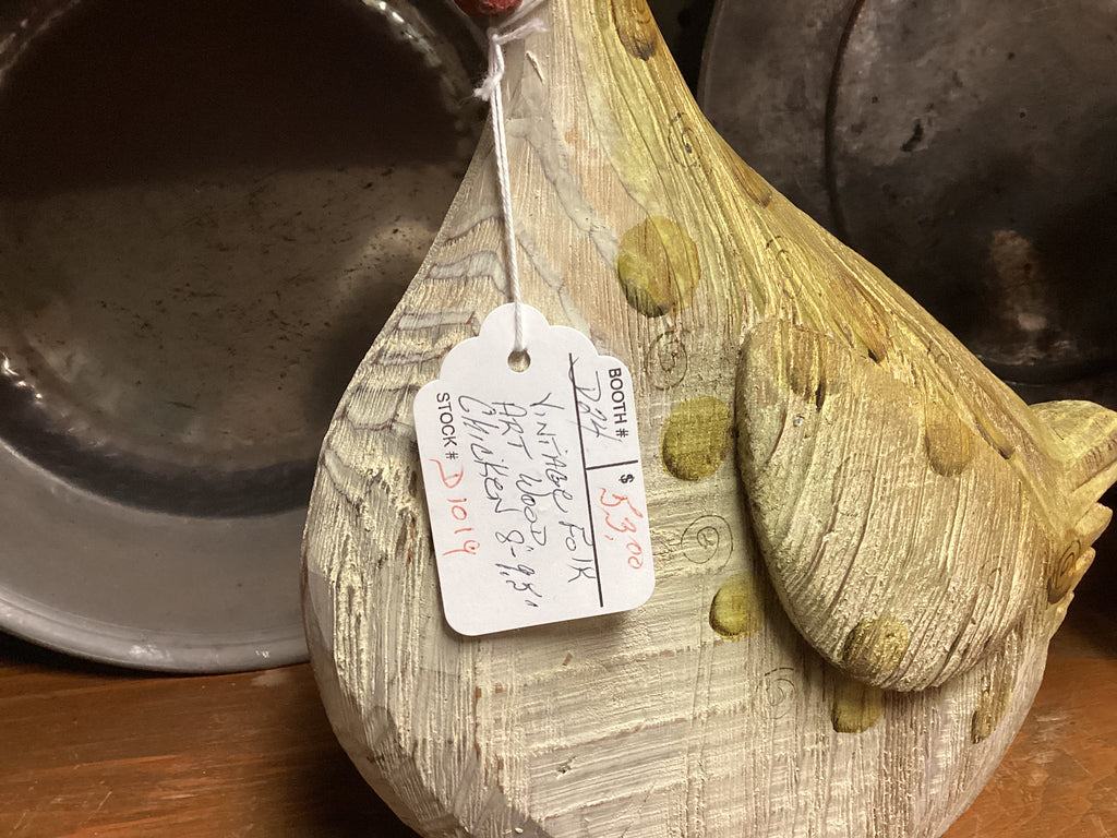 Awesome vintage carved wood Folk Art chicken. This plump chicken figure features a muted color rinse sure to add a touch of whimsy to your decor. Measures 9 1/2" tall. Photos are part of the description so please review carefully.