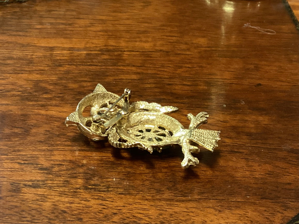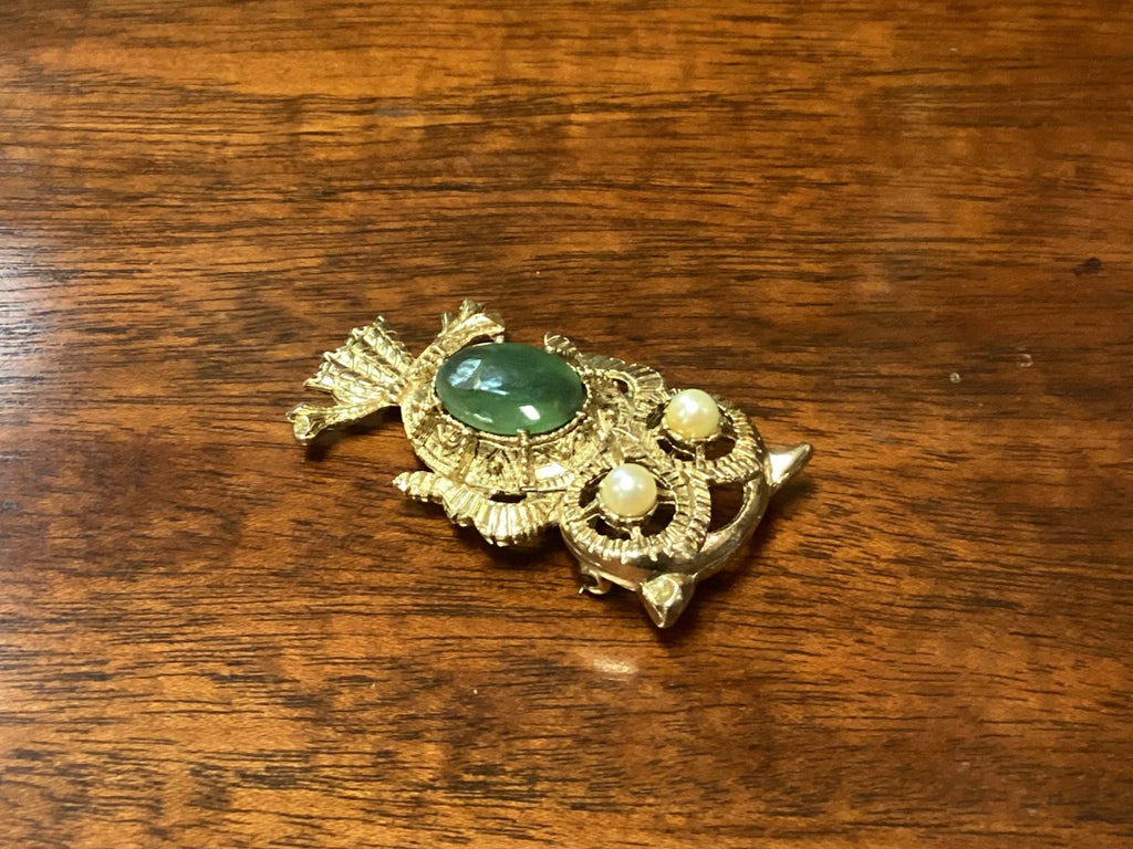 Victorian 10K Gold Owl Brooch w/ Nephrite Jade & Seed Pearls