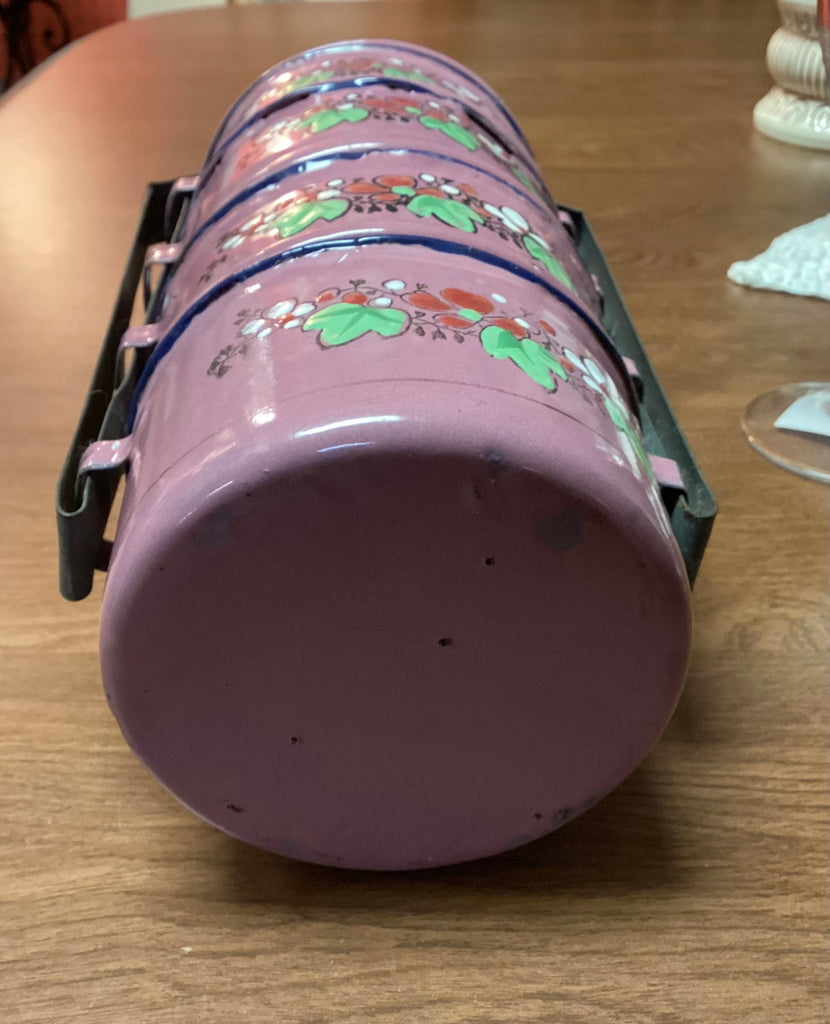 Awesome vintage enamel 4 piece stacking enamel lunch pail set. This beautiful set features a colorful floral motif on pink enamel. The four containers stack together and are fastened with a lid and handle. There is some slight wear consistent with age and use so please review photos carefully. Measures 12" tall.