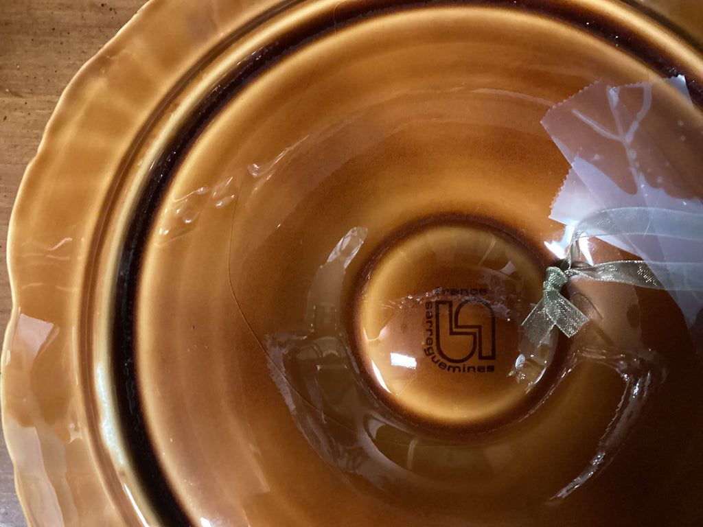 Gorgeous vintage Sarreguemines French Majolica oyster plate. This beautiful 1960's Barbotine ceramic plate features 6 geometric wells with bold green and gold glaze. There is some slight wear consistent with age and use so please review photos carefully. Measures 9 1/4" in diameter.