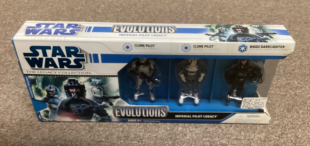 Awesome Star Wars Legacy Collection Evolutions Imperial Pilots Legacy Action Figure Set. This sweet new in the box 3 piece set includes 2 Clone Fighters and Biggs Darklighter action figures. A perfect find for the Star Wars collector. There is very slight wear to the box.