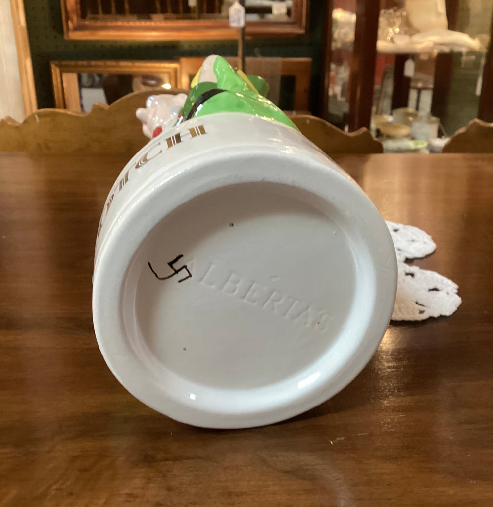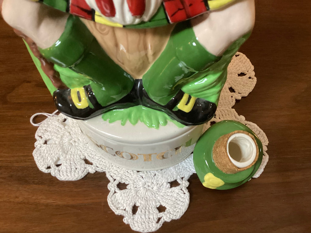Delightful vintage Alberta's Molds ceramic Scotsman scotch decanter. This awesome figural scotch decanter features a Scottish gentlemen wearing a kilt and bright green jacket. Perfect to add a dash of Mid Century fun to your home bar. Photos are part of the description so please review carefully. Measures 12 1/2" tall.