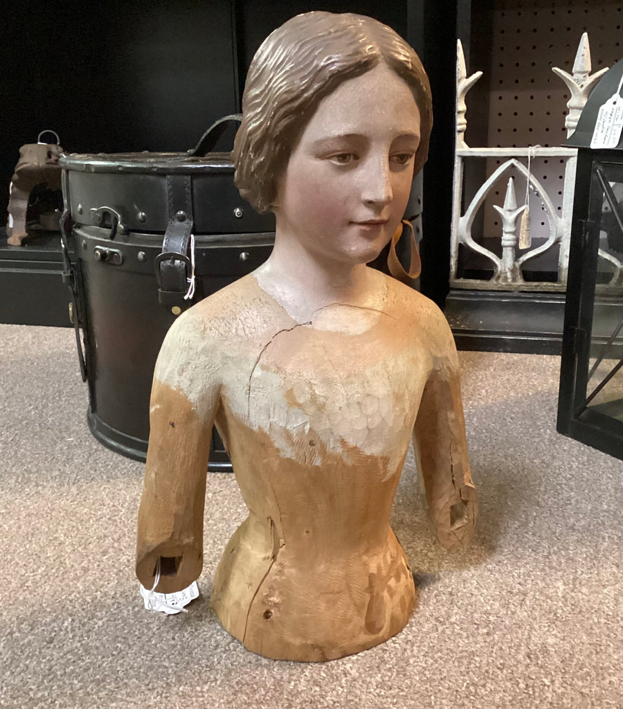 Fabulous Antique wooden Santos doll bust. Hand-carved and painted this beautiful Santos doll bust is rich with details and history. This lovely lady is sure to add a touch of quiet elegance to any vintage home. Photos are part of the description so please review carefully. Measures 14 1/2" tall x 7 1/2" wide.